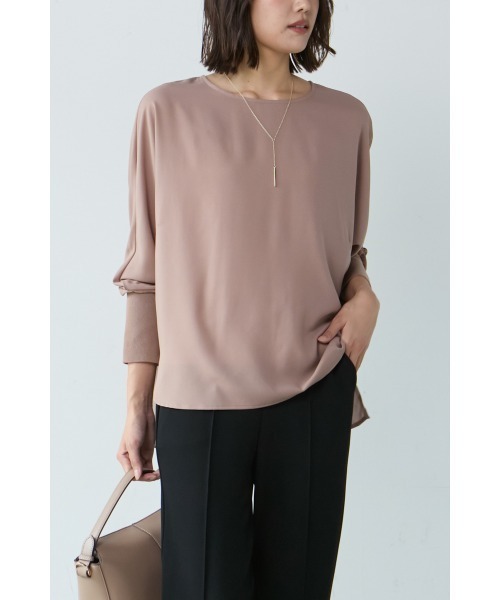 シンプルなデザインでコーディネート次第で様々な表情に対応してくれる優秀ブラウス。ゆったりとしたドルマンスリーブでボディラインをカバーし、前後差のある長めの着丈で安心感のあるシルエットです。袖口の長めのリブが、きゅっと締まりメリハリをつけてくれます。首後ろのゴールドボタンがさりげないアクセントになり、後身頃の裾部分のみサテン地になっており女性らしさもプラス。オフィスコーディネートはもちろん、デニムに合わなどカジュアルMIXスタイルまでお楽しみ頂けます。■素材なめらかで程よく落ち感のある生地を使用し、袖口のリブもストレッチの効いた柔らかい素材で着心地抜群。【透け感】オフホワイトのみややあり【生地の厚さ】やや薄手【伸縮性】ややあり