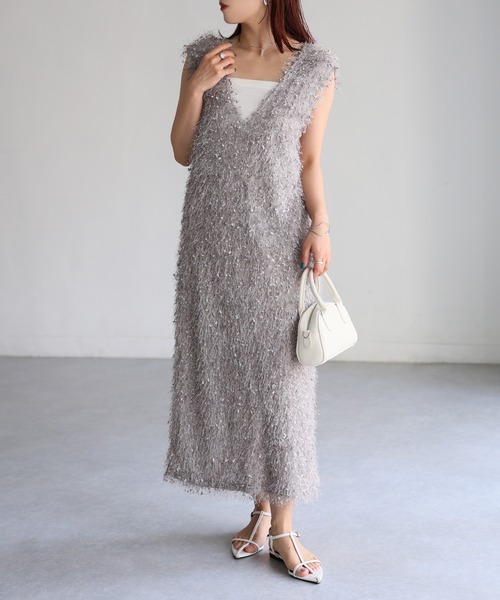 【Riberry フェザーヤーンフリンジジャンスカワンピ 】 \素材で魅せる!/ 柔らかな肌触りが心地よい旬なジャンスカワンピ♪ ■Styling 起毛感が癖になるフェザーヤーンを使用した、ジャンスカワンピが登場しました。 ボディラインを拾い過ぎないロングなナローシルエットと首元のVネックで、甘くなりすぎない繊細な印象に。 フリンジをふんだんに施すことで立体的で動きのあるデザインに仕上げました。 ニットやロンTでラフに来るのはもちろん、タンクトップやキャミソールを合わせて涼やかに◎ デイリー使いだけでなくキレイ目ブラウスにレイヤードさせれば、パーティースタイルやオケージョンシーンにも活躍できる上品アイテム♪ 合わせ方次第でロングシーズン着れるレディライクなワンピースです。 ■Detail 前後2WAYで使えるデザイン。 Vネックのデザインで、顔回りをスッキリ見せてくれる効果があります。 バックスリットが入っているので抜け感が出て、動きやすさも抜群! 裏地は短めなので足元は透け感があるデザインです。 ■Material ポリエステルなので比較的シワになりにくい素材です。 軽い素材なのでオールシーズン着回し可能。 裏地付きなので透けずに安心して着用いただけます。 ▽生地感 透け感:あり 〇●〇〇〇なし 生地の厚さ:厚い 〇〇〇●〇 薄い 裏地:あり 伸縮性:あり ※この製品は素材の特性上、着用時の摩擦等により毛が抜けることがございます。予めご了承ください。 ※商品の梱包には細心の注意を払っていますが、通販の特性上、到着時に畳みシワがついている可能性がございます。予めご了承ください ※この素材は摩擦(特に湿った状態での摩擦)や雨、汗でぬれた際には他の衣料等に色が移ることがございますのでご注意ください。 ※お肌のデリケートな方は刺激を感じる場合がございます。 ※詳しいお手入れ方法は商品タグをご参照ください。 【Information】 ◆《お気に入り登録》がオススメ◆ ・「商品のお気に入り登録」で再入荷通知や、ラストの通知、セール通知も受け取ることが出来ます。 ・「ブランドのお気に入り登録」で新商品や再入荷など、お得な情報を受け取ることが出来ます ※撮影時のライティング、ご覧になっているモニター・PC環境により、実際の商品と色味が異なって見える場合がございます。予めご了承をお願い致します。 ※他のキャンペーンにより、期間中に価格が変動する場合があります。 ※セールは予告なく終了させていただく場合もあります。