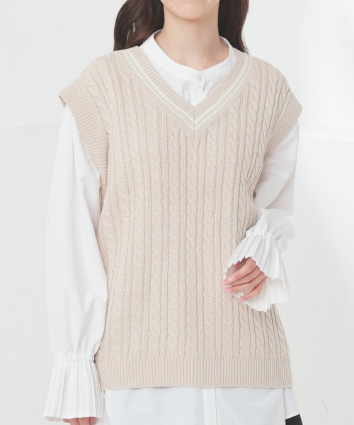 プレッピームードたっぷり 【デザイン】 衿元にラインを入れた、プレッピーな雰囲気のシンプルデザインに、ケーブル編みがアクセント。 ゆったりめの幅と腰回りが隠れる丈感。 【素材・機能】 チクチクしにくいニット素材。 【スタイル】 シャツを合わせたスクールコーデはもちろん、Tシャツ合わせのカジュアルにも、フリル衿やボウタイのブラウスと合わせた甘めスタイルにも、幅広く大活躍。 品番:636-33-1408