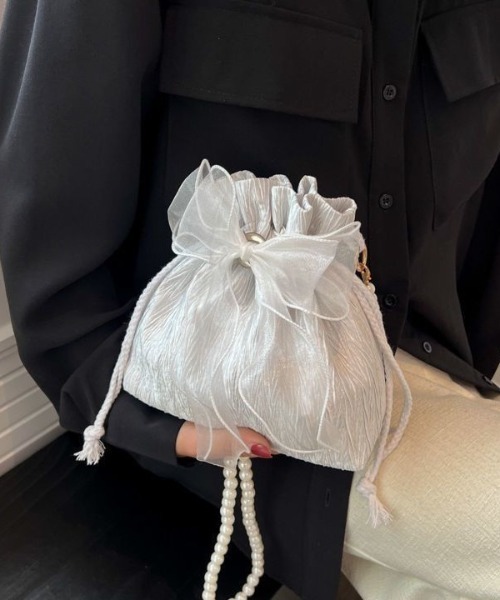 【レースリボン パールショルダーバッグ/巾着】フロントリボンがかわいいパールショルダーバッグ。使いやすい人気の巾着タイプで、財布やリップなど必要なものはしっかり入る便利なサイズ。パールのショルダーを取り外すと巾着ポーチとしても使えます。普段使いだけでなく、結婚式などパーティーバッグにもおすすめです。▶素材・ポリエステル・レジン- - - - - - - - - - - - - - - - - - - - - - - - - - - - 【ご注文の際のご注意】 ・当商品は海外生産の製品となり、プリントや糸始末などが甘い部分、若干の傷や汚れ、ほつれ等がある場合がございます。・撮影はサンプル品を使用しており、表示のサイズ感も実物とは若干異なる場合もございますので、予めご了承ください。・照明やモニターの写り具合により、画像と実際の商品の色が多少違って見える場合がございます。 ・生産時期によって色合い、生地、デザイン等に若干の違いがございます。 以上、ご了承の上ご購入をお願い申し上げます。 - - - - - - - - - - - - - - - - - - - - - - - - - - - -【気になったら是非お気に入り登録を忘れずに!】 完売カラーの再入荷や、ラスト1点の通知、セールのお知らせも受け取ることができます。