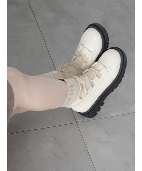 レースアップが愛らしいアクセントをプラスするニットブーツ。 伸縮性のあるニットで切り替えられており、ソックスのようにスタイリングすることができるのも魅力ポイント。 優しいフィット感で履き心地も快適です。 程よくボリューム感のあるソールで歩きやすく、さりげない脚長効果も期待することができます。 ※商品画像は、撮影環境やお客様のご利用のPC・スマートフォンのモニター環境などにより実物と色味に差異がある場合がございます。 【その他採寸】 M 全長:[ブーツ丈]17cm 幅:[履き口周り]26cm L 全長:[ブーツ丈]17cm 幅:[履き口周り]26cm