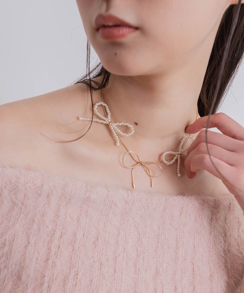 ◆2024AW新商品◆ トレンドのリボンモチーフを取り入れたネックレス。 パール×メタルの組み合わせで上品な雰囲気に仕上げました。 POINT ・トレンドのリボンモチーフ ・パール×メタルの組み合わせで大人っぽい雰囲気に ・タートルネックの上に合わせるのもおすすめ