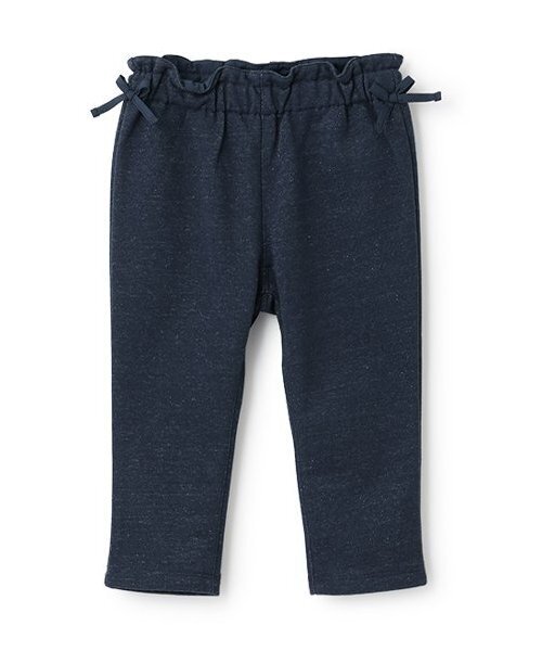 裏毛素材を使用した、細かなラメ入りのパンツです。両サイドにあしらったリボンが女の子らしい雰囲気を演出します。ウエストはゴム仕様で、脱ぎはきしやすいのもうれしいポイント。トップスをインしてフリルを見せた着こなしも可愛らしいのでおすすめです。【おすすめの着用時期は秋冬シーズン】【透け感】透けない【生地の厚さ】普通【伸縮性】あり【裏地】なし【ポケット】あり【アジャスター】なし