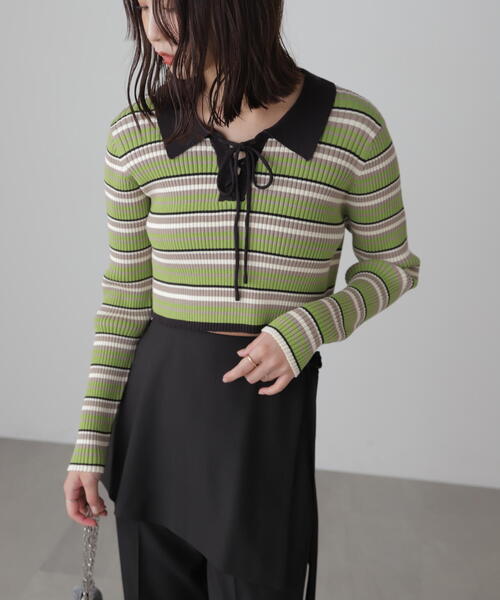 (fabric&design)ポリエステルレーヨンの糸を使用しており、程よい厚みでしっかりと目が詰まっているので型崩れせずにご着用いただけます。胸元はV開きで、共地の紐でレースアップにしています。丈はショートですが、身幅は大きめなので身体のラインを拾いすぎないのもポイントです。袖は細めなのですっきりして見えます。(styling)マルチボーダーが一枚で映えるのでシンプルなボトムスと合わせてもコーデが完成します。Y2Kのような雰囲気でデニムなどと合わせても今風で可愛いです。■透け感:なし■生地の厚さ:厚手■裏地:なし■伸縮性:あり■光沢:なし■シルエット:スモール---------------------------------------------------◆商品のお気に入り登録◆お気に入りアイテムの値下げ・再入荷・在庫1点などの通知を受け取ることができます。◆ブランドのお気に入り登録◆新商品や再入荷、セール、クーポン配布などお得な情報を受け取ることができます。---------------------------------------------------※ご注文いただいた予約商品のお届け時期の確認は、注文履歴ページより行えます。