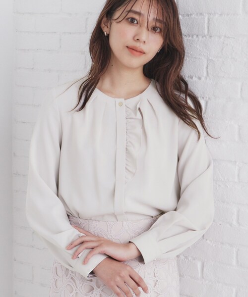 アシメフリルとゴールド釦で華やぎを添えるブラウス 【素材】 ・しなやかで落ち感のあるデシン素材を使用。 ・程良い厚みで身体のラインも拾いすぎず、光沢感が上品な印象。 ・マシンウォッシャブルにイージーアイロンとストレッチが効いているので、ご自宅で簡単にお手入れしていただけ着心地も◎ 【デザイン】 ・フロントのアシメフリルがポイントで、ゴールド釦が華やかなブラウスです。 ・衿ぐりは綺麗なクルーネックで、首周りのタックもさりげなく効いています。 ・袖口にもタックを入れ、甘すぎないパフスリーブに。 ・ラウンドヘムでインしてもアウトで着ていただいても合わせやすく、ヨーク切替にタック入りで後ろ姿もすっきり決まる一枚です。 ※照明の関係により、実際よりも色味が違って見える場合があります。また、パソコン・スマートフォンなどの環境により、若干製品と画像のカラーが異なる場合もございます。 モデル情報:身長166cm 着用サイズ:38(M) 店舗へのお問い合わせ商品番号:C58-89019 ●製品寸法: 36(S):着丈58cm B88cm 袖丈58cm 肩幅34cm 38(M):着丈59cm B90cm 袖丈59cm 肩幅35cm 40(L):着丈60cm B93cm 袖丈60cm 肩幅36cm 42(LL):着丈61cm B96cm 袖丈61cm 肩幅37cm 備考: