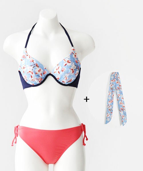 カップの部分にフラワーパターンのオ―ガンジー素材でポイントをつけて、フェミニンでありながらもインパクトのあるビキニです。オ―ガンジーの部分の同じ素材で、カチュームがセットになっている嬉しいアイテム! ※WEARに記載してある金額と、DHOLIC通販サイトに記載してある金額にシステム都合上誤差がございますが、正しい金額はDHOLIC通販サイトの方です。
