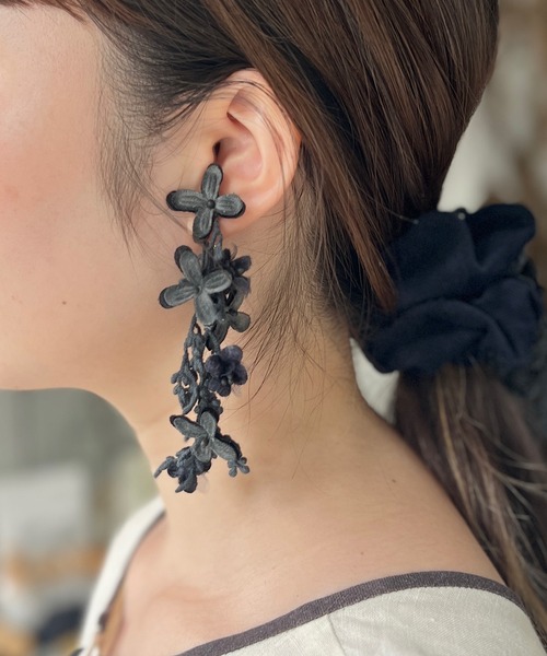 ・*:・ ライラックシリーズ・:*・ 少しピンクよりのグレーと 優しいブラックのライラックシリーズ。 2種類の生地を重ねたライラックの花びらに 染めした葉っぱやつるのレースを合わせました。 別珍やベルベットの生地とくすみ感のある 落ち着いたカラーが甘くなりすぎず大人のナチュラルコーデにぴったりです。 イヤリングはシンメトリーの揺れるデザインに。 くすみカラーは大振りですが、派手にはならにアイテムです。 < ライラックシリーズ > ネックレス / ピアス / イヤリング / イヤーフック / コサージュ / シュシュ 【m.soeur(エムスール)*】 m.soeur(エムスール)は京都発のハンドメイドアクセサリーブランドです。 植物の美しさや生命力を表現しつつもお洋服に寄り添うような、ナチュラルでクラシカルなアイテムを 制作しています。 一点一点人の手で作り上げられる手作りのアイテムは温かみがあり、使い込むごとに味わいをましていきます。 ・*:・ ・:*・ ・*:・:*:・:*・ 【注意事項】 ※こちらは一部手染めを施している商品となります。シミのように見える部分がある場合がございますが、染めの色となり、アンティークな風合いを出すためのものですので、一点一点発色が少々異なった仕上がりとなっております。 ※手作業のため、画像の商品と色、形、大きさが多少異なる場合がございますので、予め御了承下さい。 ※色落ちする場合がございますので水や雨等には十分ご注意下さい。 ※大変デリケートなお作りとなっておりますので、お取り扱いには十分ご注意下さい。