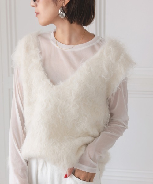 シャギーベスト ■商品説明 毛足が長く、肌触りの良いふんわりとしたシャギー素材を使用した今年らしいベスト。 深めのVネックになっているので、 顔周りをすっきり見せてくれます。 さっと取り入れるだけでいつものスタイルをアップデートしてくれ、 Tシャツやブラウスとのレイヤードスタイルもオススメです。 ■生地感 透け感:ややあり、裏地:なし、 生地の厚さ:薄手、伸縮性:あり、ポケット:なし ■サイズ(cm) 【OneSize】 身幅 約50、肩幅 約41、着丈 約62.5 ※平置き採寸のため若干のブレがございます。 ~*~*~*~*~*~*~*~*~*~*~*~*~*~* ▼ 商品のお気に入り登録 ▼ 完売カラーの再入荷通知や、ラスト1点の通知、 セールの通知も受け取ることができます。 ぜひご登録ください♪ ▼ ブランドのお気に入り登録 ▼ 新商品や再入荷など、 ブランドのお得な情報をいち早くお知らせ! ぜひご登録ください♪