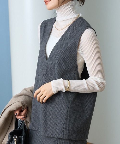トレンドのレイヤードスタイルが気軽に楽しめるベスト!秋冬らしい深みのあるカラーで細かい千鳥柄がポイントに。深めなVネックラインがが全体をスッキリとみせてくれ、ゆったりサイズでも大きくならない、メリハリのある着こなしが叶います。シャツにニットベストを重ねるトラッド感のある着こなしや、シアートップスや華奢なトップスに重ねてトレンド感を出すのもおすすめです。また、ロゴTと合わせてカジュアルに落とし込むもの◎ヒップまで隠れるゆったりとしたサイズ感なので、細身のボトムスとの相性抜群です!同素材のスカート(31490070008)とセットアップとしても合わせられます。【注意事項】※商品画像は、光の当たり具合やパソコンなどの閲覧環境により、実際の色味と異なって見える場合がございます。あらかじめご了承ください。※画像の商品はサンプルです。実際の商品と仕様、加工が若干異なる場合があります。※サイズ表記はあくまで目安となります。※その他の予約商品、通常商品との同時決済はできません。※入荷状況により、お届け予定が前後する場合があります。※お客様への発送が店頭販売より遅れる場合もあります。※追加生産商品は、一部の店舗、通販で販売中の場合がございます。予めご了承下さい。※商品を使用前に、タグ等に記載されている「取り扱い上の注意書き」「洗濯表示」を必ずご確認ください。※商品に不良が無い場合、包装紙および箱の彼損がございましても発送いたします。あらかじめご了承ください。