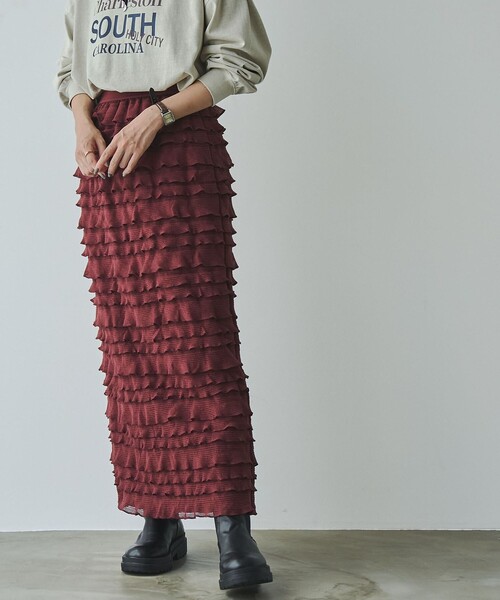 ミックスコーデに活躍する大人仕様のトレンドフリルスカート■デザイン/素材上品な印象のあるニットレースを使用したナロースカート。透け感のあるフリルを幾重にも重ねて上品な印象に仕上げました。きれいめデザインながらもウエストはゴム仕様で楽な着心地です。裏地付きで安心感があるのも嬉しいポイント。スウェットパーカーやスニーカーなどカジュアルなアイテムとのミックスコーデがおすすめです。透け感:なし生地の厚さ:普通光沢感:なし裏地:ありウエストゴム:ありサイドポケット:なし家庭洗濯:手洗い可能【注意点】※撮影商品はサンプルの為、実際の仕様と異なる場合がございます。※画像の商品は光の照射や角度、お使いのモニター環境により、実物と色味が異なる場合がございます。スタジオ物撮りの画像が実物の色味に一番近くなっております。※予約商品の場合、お届け予定はあくまでも目安となります。生産の都合上、お届け時期が前後したり実店舗入荷時期とずれる場合がございますので、あらかじめご了承ください。品名:フリルナローSK品番:76706450225