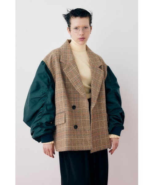 ウール混のチェック素材とM A-1素材をドッキングしたデザインジャケット。絶妙なチェック柄と、光沢感のあるMA-1素材の組み合わせが新しい一枚。ばさっと羽織れるオーバーサイズの作りでカジュアルにも綺麗目にも合わせなれるニューアイテムです。身頃は程よい厚さで織られた肌触りの優しいポリエステル/ウール素材、袖部分はMA-1調のナイロンツイル素材です。【Herin.CYE/ヘリンドットサイ】女性を表す“HER”と“凛(RIN)”、“彩(CYE)”の造語。 “常にエレガントのある日常” いつもの着こなしにエレガントな要素を入れ絶妙なバランスや味付けを加える。 現代を生きる女性の毎日を最高にしたいから。女性である事の喜びを感じる服 HeRIN.CYEらしい、HeRIN.CYEにしかない色彩豊かなバリエーション、オリジナリティのある服を提案し続けます。