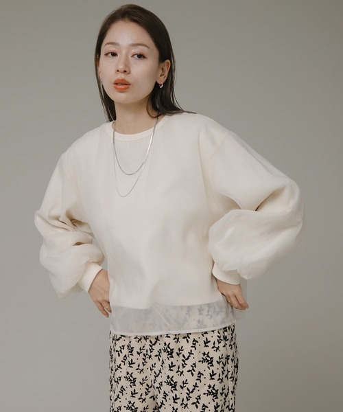 このアイテムはWEB限定商品です。 レイヤード風の着映えトップス 裏毛スウェットにハリ感のあるオーガンジー素材を合わせ重ね着風デザインに。 ふんわりとした袖のボリュームと程よくゆったりとした身幅はカジュアルながらに女性らしい1枚。 POINT ・1枚でサマになるデザイン ・トレンドのデザインで今年らしい印象に COORDINATE カジュアルでも綺麗めボトムにも合わせやすく、着回し力も抜群のアイテムです。 【2024 Autumn/Winter】【24AW】 ※この商品は、縫い目などに過度な力が加わることで滑脱(縫い目が滑って開いたり、縫いしろが抜ける)する場合がありますのでご着用の際はご注意ください。 ※その他お取り扱いに関しましては、商品に付属のアテンションタグをご覧ください。 ※商品画像は、光の当たり具合やパソコンなどの閲覧環境により、実際の色味と異なって見える場合がございます。予めご了承ください。 ※商品の色味の目安は、商品単体の画像をご参照ください。 ▼お気に入り登録のおすすめ▼ お気に入り登録商品は、マイページにて現在の価格情報や在庫状況の確認が可能です。 お買い物リストの管理に是非ご利用下さい。 素材感 透け感 : なし 伸縮性 : ややあり 裏地 : なし 光沢 : なし ポケット : なし