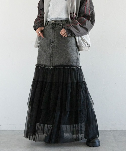 異素材ドッキングでこなれ感漂う一着。■おすすめスタイリング☆普段のカジュアルスタイルには・・・Tシャツやスウェット、ニットなど、幅広いアイテムと好相性!デザインの効いたスカートなので、シンプルトップスでもお洒落見えします◎☆トレンドライクなスタイルには・・・旬のオンブレチェックシャツと合わせて、タックイン!ワントーンでまとめると、モードでこなれ感漂うコーデが完成◎■ポイントカジュアルスタイルの定番「デニム」と、トレンドのチュール素材をドッキングしたデザインスカート!腰回りはすっきり見え、足元はフリルチュールで華やかな印象に。まとまりのあるカラーでまとめ、着回し力も◎ウエストはバックゴム仕様になっているので楽な穿き心地です!また、チュール部分には足首まであるインナーを付けているので、肌見せの苦手な方にもおすすめ。フリルチュールで程よい甘さもプラスした、今季注目のデニムスカートです!■素材適度に厚みのあるコットン仕立てで肌触りが良く、通気性・吸湿性・耐久性に優れたデニム生地。さらっと軽いチュール素材は、程よい透け感で今年らしい印象に見せてくれます。
