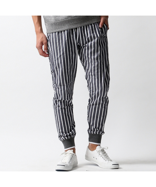 ABAHOUSE EU素材を使用したワイドピッチのストライプリブパンツ。