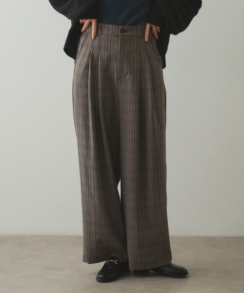 チェック柄が秋らしいワイドパンツが登場 【デザイン】 ・秋の装いにおすすめなチェック柄のダブルタックワイドパンツです。 ・ゆったり太めのシルエットでありながら、股上深めのウエスト周りはすっきりとメリハリあるデザイン。 ・コンパクトなトップスを合わせた大人カジュアルなスタイリングがおすすめです。 ・ポケット:前ポケット×2、後ろ飾りポケット×2。 【素材】 ・ストレッチ性のあるチェック柄素材を使用。 ・ご家庭でお手入れ簡単なマシンウォッシャブル素材。 ※裏地なし ※照明の関係により、実際よりも色味が違って見える場合があります。また、パソコン・スマートフォンなどの環境により、若干製品と画像のカラーが異なる場合もございます。 モデル情報:身長165cm B72 W57 H84 着用サイズ:38(M) 店舗へのお問い合わせ商品番号:637-69027 ●製品寸法: 38(M):W68~74cm H92cm 股下65cm 前股上35cm 渡り幅34cm 裾幅27cm 40(L):W70~76cm H95cm 股下66cm 前股上36cm 渡り幅35cm 裾幅27cm 42(LL):W72~78cm H98cm 股下67cm 前股上37cm 渡り幅36cm 裾幅28cm 備考: