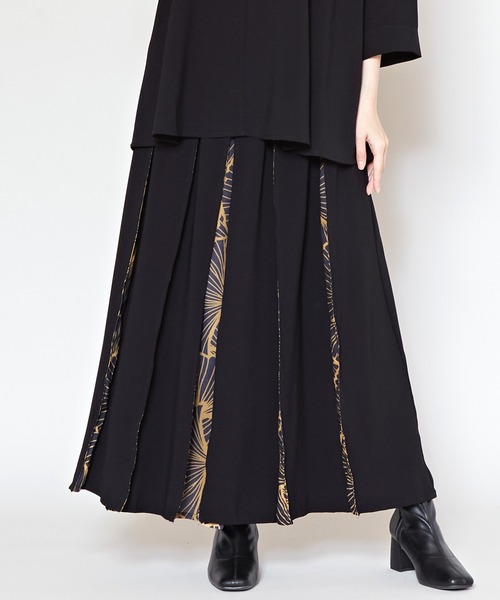 SHIKIを纏う。日本の四季を身近に感じよう。 日本には四季が存在する。四季折々の情景、実り、色がある。そんな四季からインスピレーションを受けた柄や色は、どれも華やかで、どこか繊細。身に纏うことで季節の素晴らしさを感じ、四季を愉しむきっかけになってほしい。 ………………………………………………………… 着物の隠れたお洒落『八掛(はっかけ)』をイメージしたデザイン。 歩いた時に、プリーツに入った植物柄がちらりと見える、粋でお洒落なロングスカート。 シワになりにくい生地で、ゆったり穿けるシルエット。 手軽に和モダンスタイルを愉しめます。 四季を纏い、季節の移ろいを身近に感じて。 ・両サイドポケット付き。 ・ウエストゴム仕様 MAX~96cm ●ブラック【銀杏 いちょう】 ●グリーン【金木犀 きんもくせい】 ●ネイビー【葡萄 ぶどう】 ●レッド【南天 なんてん】 ◆カヤ◆ 古くから伝わる日本の伝統と新しい文化の融合。 「新しいカタチの日本」に出会える倭物ブランド【カヤ】 「文明開化」をテーマに、倭モダンで色彩あふれる刺激的な和雑貨を提案していきます。 ※こちらの商品は1点1点職人による手作りとなります。その為、生地の取り方により柄の配置や形・色合いなど若干異なる場合がございます。あらかじめご了承ください。 Amina Collection Co.,LTD.