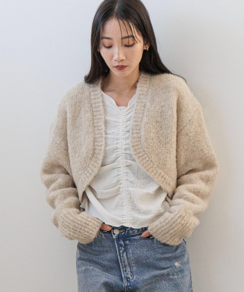 ■デザイン■今年らしいデザインのショートボレロ。Tシャツやシアーインナーにさらりと羽織るだけで着映えする1枚です。ふわふわとした素材感で着心地も良くなっています。■スタイリング■コンパクトなサイズ感なので様々なボトムと相性良く着用いただけます。ワイドパンツでルーズに着崩すスタイリングが今年らしくオススメです。