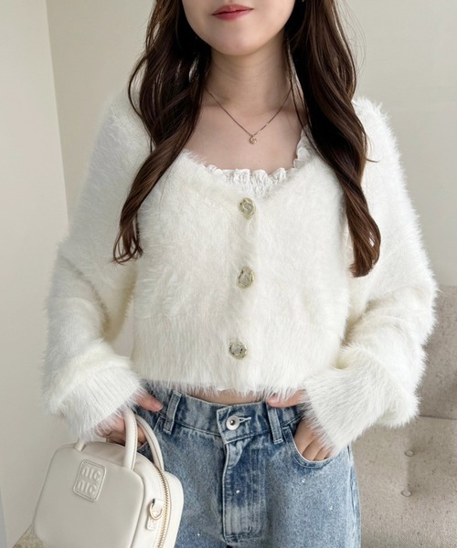 ~NICECLAUP 2024 Autumn Collection~ ふわふわな着心地のカーディガン。 柔らかい毛足のフェザーを使ったナイスクラップらしいニットカーディガン。 気持ちの良い肌触りが魅力の一つ。 フロントのゴールドボタンは存在感バツグン!コーデのアクセントになります。 着丈はクロップド丈なので短めのお作りになり、ミニボトムはもちろん、ロングボトムとの相性も抜群。 ボリュームのあるゆったりとしたシルエットのお袖がポイント。 羽織としてはもちろん、ボタンを閉めてプルオーバーっぽく着こなすのもおすすめ! 品番:0142050440でロング丈ver.もチェック! ■オススメスタイリング ミニスカートなどミニボトム合わせが◎ 着丈が短いのでロングスカートやワイドパンツとの相性も抜群。 ショートブーツ、ロングブーツと合わせたスタイリングがおすすめ。 Tシャツやキャミソール、シアートップスを合わせてレイヤードすればカジュアルライクな着こなしに。 ブラウスと合わせればフェミニンなスタイリングが完成します。 ------------ 裏地:なし 伸縮性:あり 生地の厚さ:普通 生地の重さ:普通 洗濯 :手洗い/ウェットクリーニング ------------- ※ニットアイテムは、素材特性上以下の点にご注意下さい。 ●この製品は素材の特性上、着用やクリーニングにより、毛羽立ちや毛玉が発生することがあります。 1、1日着用した際は、2.3日休ませるなどしてご使用ください。 2、毛玉が出来てしまった場合は、毛玉取り器、又はハサミで丁寧にカットして取り除いてください。 ●この製品はデザイン性、風合いを重視し編みたてたニット製品です。 着用により若干の伸びが生じますのでご了承お願いします。 又、保存時のハンガーのご使用は避け下さい。 ※サンプルでの撮影のため、実際のものと仕様や色が異なる場合があります。 ※室内、室外での撮影のため実際より明るく映っていたり、暗く映っていたりする場合がございます。 ※品質表示を必ずご確認下さい。 【商品のお気に入り登録】 完売カラーの再入荷や、ラスト1点のお知らせ、セールの通知を受け取ることができます。 【ブランドのお気に入り登録】 新作入荷や再入荷情報など、ブランドの情報をいち早くお届けします。 ぜひご登録ください♪