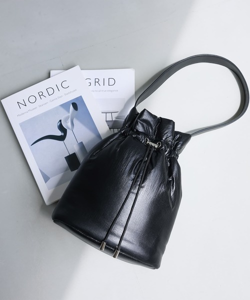 ■デザイン中綿入りのふっくらとしたボリューム感が特徴的な、パデッドデザインのトートバッグ。マチありでコンパクトながらも外出時に必要な荷物はしっかり入るサイズ感です。開口部は巾着風に絞っても、そのままでも使用可能。内側にはオープン&ファスナーポケット付き。■コーディネートかっちりし過ぎない、ふっくらとしたシルエットとシンプルなデザインで、普段のコーディネートに取り入れやすいバッグ。メタリックカラーはデイリーコーデにプラスするだけで着こなしのポイントになります。■素材ワッシャー加工された表面感のある柔らかな生地。ショルダー部分はフェイクレザーを使用しています。