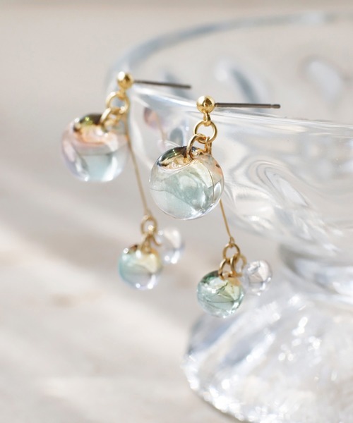 透明感たっぷりなスフィアが艶めき、横顔に華やかさを与えるピアス。 ふとした仕草で揺れるモチーフが、女性らしい雰囲気に導きます。 ※ATTENTION※ ■微細なキズや製造ムラはすべての商品に含まれます。