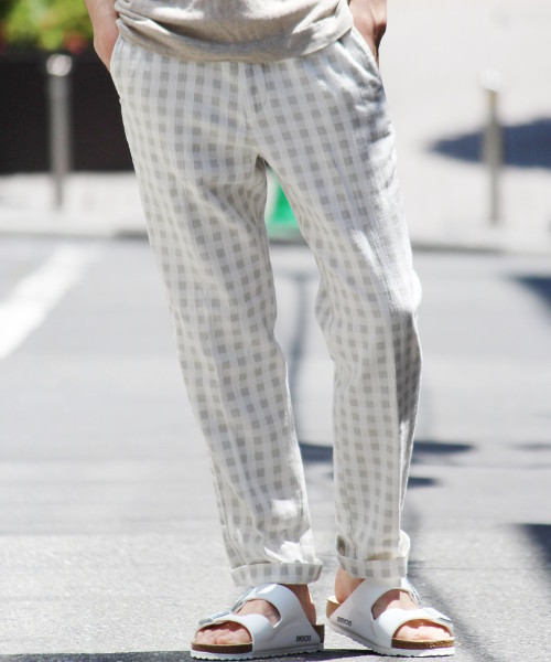 417 by EDIFICE(フォー ワン セブン バイ エディフィス) 太い糸と細い糸の交織によって立体感を表わしたプリペラの生地にギンガムチェック柄を施したイージーパンツ。 素材は、コットンに麻(リネン)を混合させることで、ドライな印象と通気性が良く、春夏シーズンを快適にお過ごしいただけます。 シンプルなトップスとコーディネイトしたリゾート、リラックス感のあるスタイルにおススメです。 417 by EDIFICE 「French Preppy」若々しく自由な感性で着崩すフレンチトラッド。 「Traditional」マインドをベースに「Marine」、「Military」、「Work」、「Sport」スタイルから派生したデイリーウェア。 通年展開のシャツ、パンツをメインアイテムとして展開。