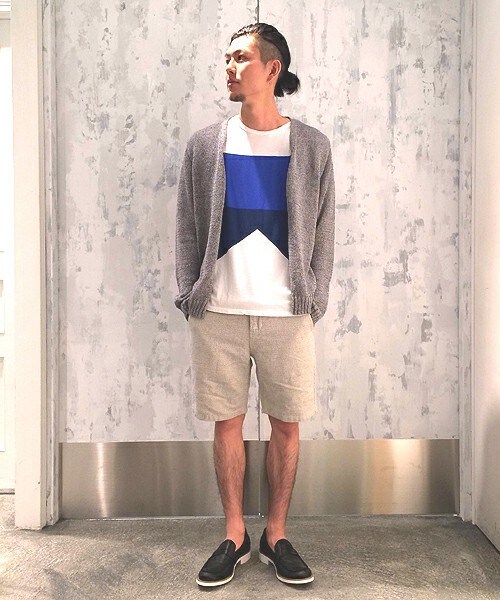 無地のショーツのようにも見えますが、表面に立体感がある変型織りのショーツです。表情のある生地ですのでシンプルなシャツやTシャツとの相性が良いです。