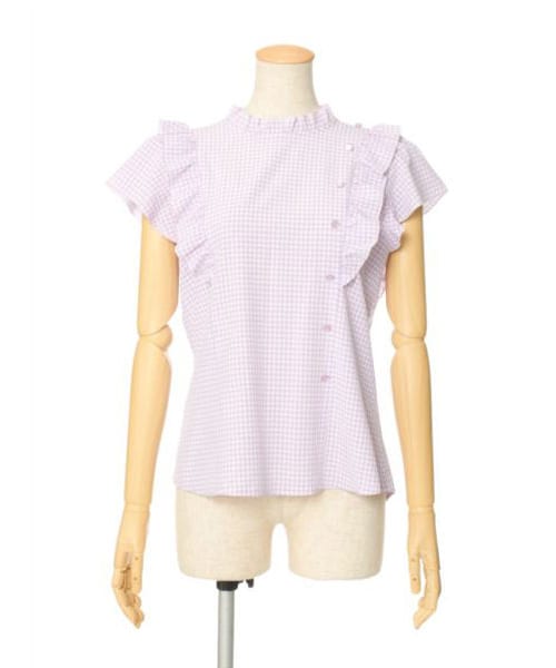 プチハイネックと袖のフリルがガーリーなギンガムチェックのブラウス。 左サイドに寄せた小さめボタンがレトロなアクセントになっています。 ふんわりとしたお袖ですっきりとしたアームラインを演出。 フレアなスカートにブラウスをインするとウエイタールックが完成します♪ MATERIAL:polyester90%polyurethane10% Made in China モデル身長:158cm サイズ:フリー 着丈:60cm 胸囲:90cm肩幅:33cm ウエスト:88cm 袖丈:11.5cm