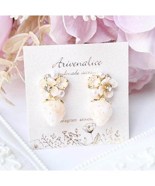 いちごのカラーに合わせたクリスタルを使用したフラワービジューデザインのイヤリングです。クリスタルがキラキラと輝きコーデを華やかに彩ります。全11色。推しのイメージカラーを身につけたい方や誕生石カラーを身につけたい方におすすめです。普段使いからフォーマルまで様々なシーンでお使いいただけます。《クリスタルカラー全12色》・ホワイト・・・リネンイグナイト・ブラウン・・・カプチーノディライト・ピンク・・・ダスティピンクディライト・レッド・・・マルーンイグナイト・オレンジ・・・サン・イエロー・・・ライトトパーズ・グリーン・・・エメラルド・ブルー・・・サファイア・水色・・・スカイイグナイト・パープル・・・パープルイグナイト・ブラック・・・グラファイト同デザインのイヤリングも別ページにて販売中です。ZOZOTOWN内で「Arivenalice」と検索すると販売作品一覧が表示されます。