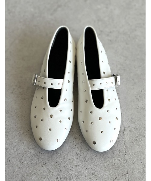 モダンなスタイルにクラシックなエッジを加えた1足 洗練されたデザインが魅力のラウンドトゥスタッズフラットシューズ。 スタッズのアクセントが、シンプルながらもエッジの効いたスタイルを叶えます。 丸みを帯びたラウンドトゥデザインが、スタッズのハードな印象をバランスよく調和。 フラットなソールやベルトモチーフが、歩行時の安定感を提供し、快適な履き心地をサポートします。 あえてチュールスカートやワンピースなどのフェミンなアイテムと合わせた、ミックススタイルがおすすめ。 シンプルなデニムやヴィンテージライクなカーブデニムを合わせると、こなれ感のある大人カジュアルスタイルが完成します。 普段はもちろん、ちょっとしたお出かけまで幅広いシーンにマッチする1足です。 素材・着用感 柔らかな合成皮革 ▼お取り扱いについて ※素材の性質上、染料のにおいが多少感じられる場合がございます。数日のご使用や陰干しなどで気になる匂いはほとんど感じられなくなりますので、お試しくださいませ。 ■モデル着用写真は撮影環境により、 多少実際のカラーと異なる場合がございます。 お気に入りショップにご登録いただきますと、 ショップニュースを、いち早くお届けいたします。