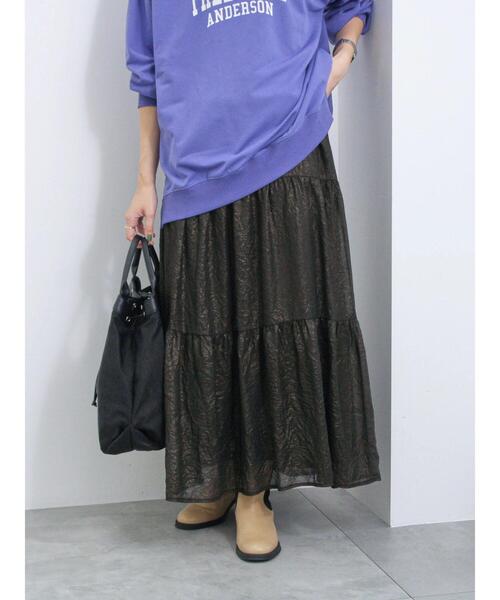 オーロラのような輝きとしわ感が華やかな印象を演出するロングスカート。 ティアード切り替でふんわりとしたボリューム感のある愛らしいシルエットに仕上げました。 ウエストは穿きやすい総ゴム仕様になっており、安心感があります。 コーディネートの主役にもなる目を惹く華やかなアイテムです。 ※商品画像は、撮影環境やお客様のご利用のPC・スマートフォンのモニター環境などにより実物と色味に差異がある場合がございます。