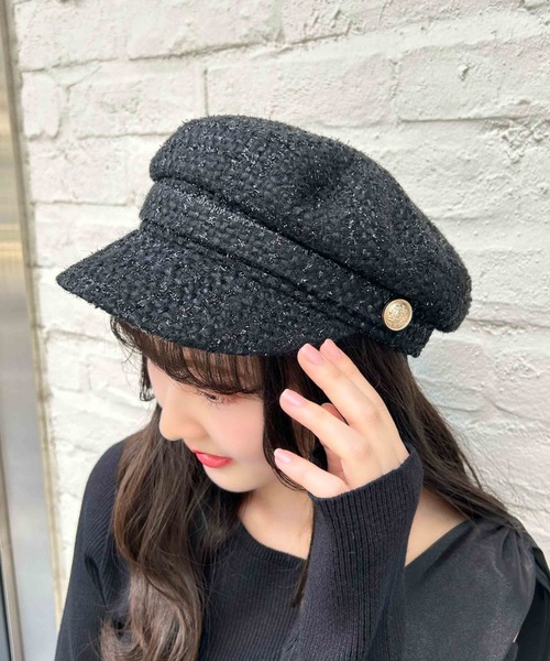 クラシカル&レディなコーディネイトが完成するツイードキャスケット。 ラメを織り込んだ生地で仕立てているので華やかな雰囲気です。 サイドにあしらったツヤ消しゴールドのボタンがアクセントに。 ガーリースタイルにはもちろん、大人コーデのアクセントにもぴったりなアイテムです。 ・内側のテープで簡単にサイズ調整が可能です。