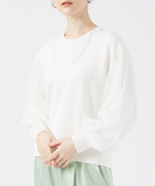 *Detail*身頃はニット、袖はチュールとニットの2枚重ねで仕立てた、シンプルながら華やかさが際立つ一枚。軽やかさがありつつ、袖もしっかりとしたデザインで、季節を問わず活躍する万能アイテムです。*Coordinate*チュール素材を重ねたコンビニットは、エレガントさを演出しつつ、カジュアルにも着こなしやすいアイテムです。キレイめな印象が強く、スカートやパンツともバランスよく合わせられます。季節を問わず、シンプルながらもコーデに華やかさを加える万能な一枚です。【商品のお気に入り登録】完売カラーの再入荷通知や、ラスト1点の通知、プライスダウンしたセール通知も受け取ることができます。【ブランドのお気に入り登録】新作や再入荷等、いち早くブランドのお得な情報を受け取ることができます。