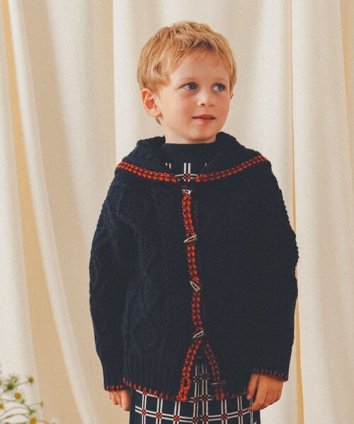 ノスタルジックな温もりをざっくりとしたケーブル編みに、セーラーカラーが新鮮なニットカーディガン。秋冬のマリンスタイルをニットで表現した一枚です。配色のラインやブランケットステッチ、フロントのトグルボタンなど、クラフト感溢れ温かみのある仕上がりです。やわらかな肌触りでチクチクしづらく優しい着心地で、手洗い可能なのも嬉しいポイントです。男の子も女の子も合わせやすいデザインとカラー展開。ボトムにもニットパンツを合わせたスタイリングがこの冬のおすすめです。■ケア方法水洗い可(詳細は商品についている品質表示ラベルをご覧ください)生地の厚さ:厚手伸縮性:ややあり裏地:なし【対象年齢:およそ4~11歳】Boy Model::H109(cm)Size:110Girl Model::H110(cm)Size:110※光の当たり具合やパソコンなどの閲覧環境によって実際の色味と異なって見える場合がございます。予めご了承ください。※商品の色味は商品単体で撮影した画像をご参照ください。WEB(C)MilK MAGAZINE JAPONより再録こども ビームス / コドモ ビームスこどもたちの豊かな感性や想像力を、よりいっそう伸ばすきっかけになるモノやコトを提案する〈こども ビームス〉。日々成長するこどもとのかけがえのない時間が心豊かで、もっと素晴らしいものになるようなモノやコトを提案しています。