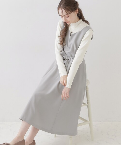 ハートネックが可愛いフィット&フレアー型のジャンスカ~POINT~ウエストマークで足長効果があり、スタイルUP効果が期待できます◎ウエスト共地リボンは取り外し可能なので、スタイリングに合わせて着用頂けます後ろウエストはシャーリング風のゴム仕様なので、着やすく着心地もよいです◎【素材・機能】帯電防止機能糸を一部織り込んだ素材を使用柔らかく、落ち感があり、ソフトなメランジの綾織りの生地を使用しています※裏地あり※照明の関係により、実際よりも色味が違って見える場合があります。また、パソコン・スマートフォンなどの環境により、若干製品と画像のカラーが異なる場合もございます。【スタッフコメント】・saori(153 )ハートネック部分のデザインが可愛く、スタイルもキレイ見えする優秀ワンピースです◎ブラウスとレイヤードしたり、カーディガンと合わせた上品な着こなしがおすすめです!【24AW NEW ARRIVAL】【24AW NEW COLLECTION】モデル情報:身長167cm B80 W59 H82 着用サイズ:38(M)店舗へのお問い合わせ商品番号:508-59006●製品寸法:36(S):着丈98cm B89cm 肩幅34cm W69cm H102cm38(M):着丈101cm B92cm 肩幅35cm W72cm H105cm40(L):着丈103cm B95cm 肩幅36cm W75cm H108cm42(LL):着丈104cm B98cm 肩幅37cm W78cm H111cm備考: