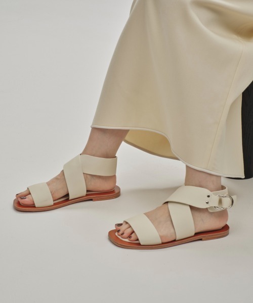 太めのレザーベルトが目を惹くフラットサンダル。歩き易さや履いていくうちに馴染んでいくレザーの質感も魅力。ワンピース合わせはもちろん、パンツスタイル等にも合わせやすく、様々なスタイリングに馴染む万能サンダルです。