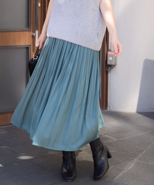 上品な揺れ感♪サテンの消しプリーツスカート [素材] ・マットな光沢感のヴィンテージサテンを使用したプリーツスカート。 [デザイン] ・落ち感のある細めのプリーツに、体の気になるラインを隠してくれる程よいフレアなシルエットと上品な丈感がポイント。 ・ウエストはゴム仕様で着心地が良くてらくらく! ・トップスインしたときのワンポイントにもなるよう、フリルをあしらったのもポイント。 [スタイリング] ・プリーツのデザインを引き立てるシンプルトップス合わせや、ジャケットとの相性もよく、オフィスからカジュアルまで幅広いシーンで活躍します。 ※発送上の状態によって商品に若干のたたみシワがある場合がございます。予めご了承くださいませ。 着用前に洗濯タグ・品質表示に従ってアイロンまたは、スチームアイロンをかけていただく事をおすすめします。 ※照明や光の当たり具合で色味が違って見える場合があります。 <24AW Collection 24Autumn&Winter> --------------------------------------------------- 【Pillini】 「Pillini/ピリーニ」 フィンランド語で「私の笛」 口笛を吹きながら笑顔で過ごせる… そんな何気ない豊かな毎日を彩るトレンド感のあるきれいめカジュアルウェアーを手に入りやすいプレミアムプライスで提案します。 --------------------------------------------------- 【お買い物をよりお楽しみいただくために】 ・商品のお気に入り登録をおすすめします! ♡マーククリックで登録できます。 完売カラーの再入荷や、ラスト1点になったときの通知、 セールの際に通知などお得な情報を受けることができます。 ・ブランドのお気に入り登録もご一緒にお願いいたします! 新商品や再入荷、などいち早くブランドの最新情報をお届けします。