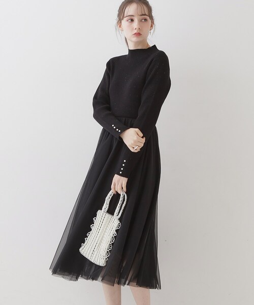 ほんのりキラキラ感のあるやわらかいリブ編みニットと、ふんわりと広がるチュール素材をドッキングしたワンピース~POINT~チュール素材が軽やかなので、重たい印象にならず一枚でスタイリングが完成しますリブ編みなのでストレッチ性があり着心地が良いですパール調の飾りがついたお袖がアクセントに◎【素材・機能】※ハンドウォッシャブル機能付き※スカート部分のみ裏地あり※ピンクベージュ(053)はやや透け感があります。※照明の関係により、実際よりも色味が違って見える場合があります。また、パソコン・スマートフォンなどの環境により、若干製品と画像のカラーが異なる場合もございます。【スタッフコメント】・saori(153 )これからの季節にぴったりのニットワンピースです!羽織との相性も良く、重たくなりがちな冬スタイルもチュールスカート部分で全体のバランスが軽やかに♪【24AW NEW ARRIVAL】【24AW NEW COLLECTION】モデル情報:身長167cm B80 W59 H82 着用サイズ:38(M)店舗へのお問い合わせ商品番号:508-59035●製品寸法:36(S):着丈115cm B70cm 袖丈55cm 肩幅31cm W63cm38(M):着丈118cm B74cm 袖丈56cm 肩幅33cm W67cm42(LL):着丈123cm B81cm 袖丈58cm 肩幅35cm W74cm備考: