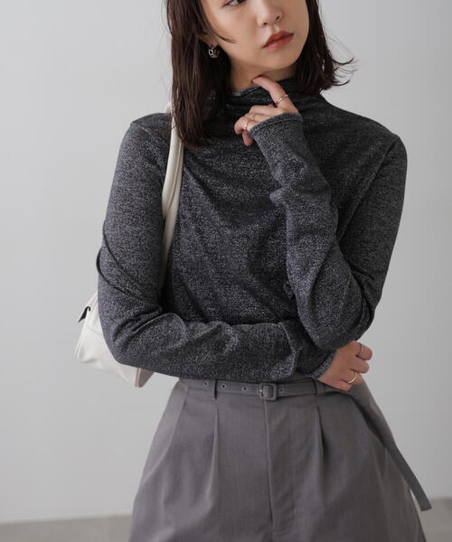 〔fabric&design〕 レイヤードコーデに幅広くお使いいただけるハイネックカットソーです。 程よい透け感とラメのカジュアルな表情が上品で、着回し力が高くおススメ。 袖丈をやや長めに設定しているので、レイヤードスタイルが決まりやすく、襟ぐりと袖口をメローで軽く仕上げているのもポイントです。 〔styling) スウェットやニット、キャミワンピースなどレイヤードスタイルで、襟や袖をのぞかせて今年らしいスタイリングを楽しむのもおススメです。 ■透け感:ややあり ■生地の厚さ:薄手 ■裏地:なし ■伸縮性:あり ■光沢:あり ■シルエット:スタンダード --------------------------------------------------- ◆商品のお気に入り登録◆ お気に入りアイテムの値下げ・再入荷・在庫1点などの通知を受け取ることができます。 ◆ブランドのお気に入り登録◆ 新商品や再入荷、セール、クーポン配布などお得な情報を受け取ることができます。 ---------------------------------------------------