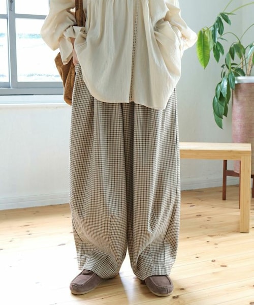 今季一押しのチェックシリーズのボリュームパンツ。 甘くなり過ぎない細かなチェック柄で大人ナチュラルな秋冬コーデが叶います。 定番のボリュームシルエットでかっちりし過ぎずカジュアルな雰囲気に。 ダブルタックでウエストにポイントのあるボリューム感が魅力の1枚です。 ふんわりとしたゆとりのあるシルエットで脚のラインを拾わず体型カバーにも◎ 同シリーズのシャツブラウスとのセットアップでの着こなしはもちろん、 ブラウスとの大人ナチュラルなスタイリングやスウェット等のカジュアルなアイテムとも相性抜群! 合わせるトップスを選ばずに着回せる万能アイテムです。 バックウエストはゴム仕様でストレスフリーな穿き心地。 ポケット付きで実用性があるのも嬉しいポイント。 ベルトループ付きでお手持ちのベルトとのコーディネートも◎ シワになりにくい落ち感のあるチェック生地。 膝下まで裏地付きで安心して穿いていただけます。