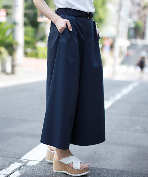 程よいハリ感と光沢のある今季トレンドのワイドパンツ。 フロントタックとバックにギャザーを寄せて動きのある表情に仕上がりました。ウエストベルトをポイントに、フレアに広がるシルエットがクリーンで女性らしい印象に。 足元はローファーで合わせたマニッシュなスタイルにもマッチします。 店舗へお問い合わせの際は下記品番をお伝えください。 品番:63-23-0082-690