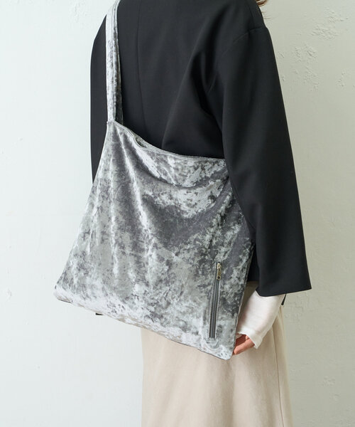 季節感を楽しめるベロア素材のトート ぎらぎらしすぎない上品な光沢感が特徴のクラッシュベロアのトートバッグ。ショルダー紐は中央で結ぶデザインになっており、好みの長さに自由に調整して使うことができます。しっかりした厚みなので、通勤や通学等デイリーに使うのにぴったり!バッグ外側にはファスナーポケットがついており、スマートフォンやパスケース等の収納がささっとできて便利です。秋冬らしいベロア素材は取り入れるだけで、季節感あるコーデに。ベーシックな色味の2色展開なので、カジュアル、きれいめ問わず合わせやすいのも魅力です。