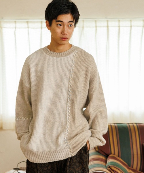 トレンド感漂う万能プルオーバー ◆同色系の2トーンカラーで切り替えたところにランダムに絣染めのロービング糸でかがりステッチを入れたニットプルオーバー。 ◆アシンメトリーな切り替えとかがりステッチがポイントに。 ◆大きめのサイジングでゆったりと着れるアイテムです。 ◆着丈はスタンダードなので、ボトムスを選ばず幅広いスタイルに合わせて着用していただけます。 -ニコスタッフのおすすめスタイリング- 2トーンの色味を汲み取った同系色のパンツと合わせて統一感アップ! スラックスできれいめに。コーデュロイパンツでより季節感の溢れるコーデにしてみてはいかがでしょうか。