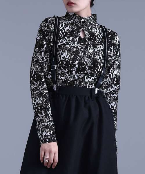 ■デザイン洗練されたデザインの総柄ハイネックトップス。前身頃にはさりげなく涙あきデザインを施し、シンプルながらも個性的な印象に仕上げています。また、袖口には涙あき部分と同じシルバー釦を配し、全体のデザインに統一感を持たせています。■ディテール表面感のあるシルバー釦が、さりげなくもスタイリッシュなアクセントとなります。■コーディネートカジュアルにもフォーマルにも合わせやすい一着。シンプルにパンツと合わせるのはもちろん、ジャンパースカートやサスペンダー付きボトムスと合わせたレイヤードスタイルもオススメです。■素材しっかりとした厚みのジャカード生地。秋口からのスタイリングに合わせやすい生地感です。