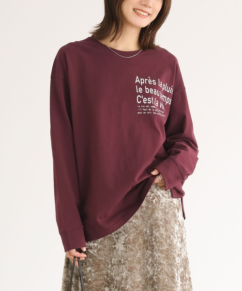 ■デザイン テキストプリントがポイントになった、ゆるっと着られるロンT。両サイドのスリットが抜け感を演出します。 ■コーディネート デニムやカジュアルなボトムスはもちろん、きれいめなボトムスと合わせてもバランスの良いスタイリングに。ウエストインしやすく、スリット入りなのでアウトもお洒落に決まります。 ■素材 程よい厚みで着心地の良い、コットン100%の天竺素材を使用しています。