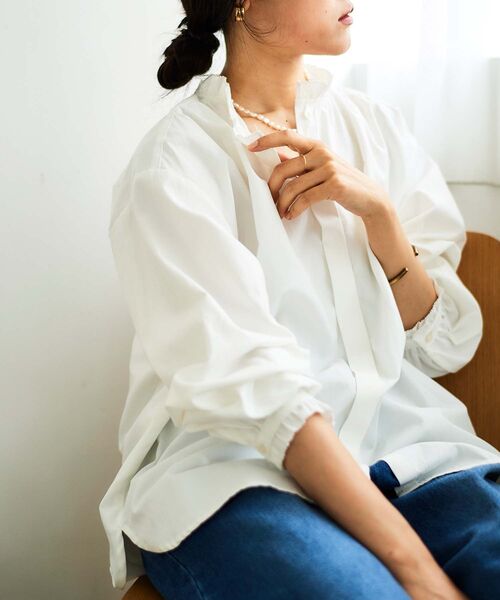 袖口・衿ぐりにフリルを施した華やかなデザインブラウス。●ポイント衿下と肩下のギャザーデザインが、大人フェミニンな印象です。しっかりとしたシャツ地ですが、程よいオーバーシルエットでカッチリしすぎず着ていただけます。●おすすめコーデデニムなどのカジュアルなボトムと合わせやすく、ニットやスウェットとの重ね着、キャミワンピやオールインワンとのスタイリングもおすすめです。合わせるアイテム次第でON/OFF問わず活躍するアイテムです。