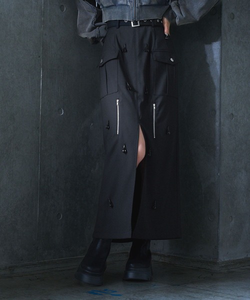 ーーー トレンド感のあるビジューを使用した モードなハイウエストナロースカート ーーー point □ビジューは一つ一つ手付けし、ランダムな配置したのがポイント □ポケットやジップ、鳩目などデザイン性のあるスカートにビジューをプラスすることで、より特別感のあるアイテムに作成 □体のラインが響かないストレートシルエット □スリット入りで足さばきがしやすく、着用しやすい styling トップスは細身でもゆったりでも合わせやすいですが、 インしての着用が細見え+足長効果があるのでおすすめです。 長めのシャツやスウェットなどを上から重ねてずるっと着るのも可愛いです。 set item 同生地のジャケットブルゾンとセットアップで着ると、更にモード感たっぷりなスタイリングになりおすすめです。 セットアップ対応アイテムはコチラを検索→【150166】 【EDGY MODE】 Concept 「マニッシュとフェミニン」「繊細と大胆」 相反するファッション要素をつなぎ合わせることで 前衛的かつ、エッジの効いた粋なスタイルを提案。 HAREの持つクールな印象をより強調し “ブラック”をキーカラーに、 多様なマテリアル×デザイン性による ここにしかないアクセントが光る新たなラインが誕生。 ※撮影環境により、光の当たり具合で 色味が違って見える場合があります。 あらかじめご了承下さい。