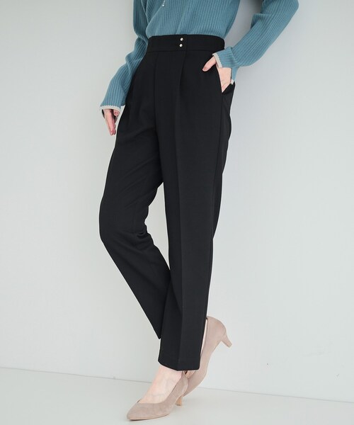 【デザイン】 デイリーに使えてきちんと見えもするテーパードパンツです。 美脚シルエットを意識したすっきり見えするシルエットになっています。 ウエストの小さなボタンデザインがワンポイント。 ストレッチが効いていて、ウエスト後ろがゴム仕様なので楽に穿いていただけます。 無地2色、チェック柄1色の3色展開です。 ※ポケット数:横×2 【スタイリング】 チェック柄はワンツーコーデも華やかに仕上がり、秋らしいスタイルに。 無地のカラーはすっきりときちんと見えする印象で、オフィスや学校行事にもおすすめです。 ブラウス合わせやハイゲージニットできれいめなオフィスカジュアルスタイルはもちろん、 ざっくり編みのニットやスウェットと合わせたカジュアルな着こなしもおすすめです。 トップスやスタイルを選ばずに穿いていただける一枚です。 【素材】 ストレッチの効いた柔らかいツイル素材。 マシンウォシャブル可。 ※裏地なし ※照明の関係により、実際よりも色味が違って見える場合があります。また、パソコン・スマートフォンなどの環境により、若干製品と画像のカラーが異なる場合もございます。 モデル情報:身長166cm B80 W59 H85 着用サイズ:02(M) 店舗へのお問い合わせ商品番号:741-69016 ●製品寸法: 02(M):W68~76cm H88cm 股下66cm 前股上31cm 渡り幅29cm 裾幅17cm 03(L):W71~79cm H91cm 股下67cm 前股上31cm 渡り幅31cm 裾幅17cm 04(LL):W74~82cm H94cm 股下69cm 前股上32cm 渡り幅33cm 裾幅18cm 備考: