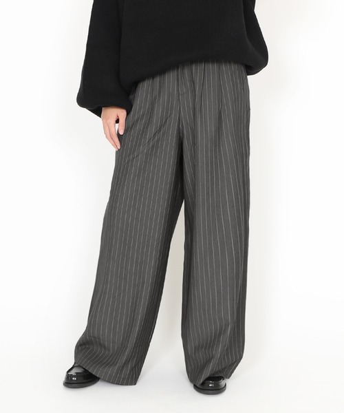 ピンストライプと2タックを施したデザインは縦のラインを強調しすとんと落ちる綺麗なシルエットを演出。脚のラインを拾わず、ウエストはバックゴム仕様でストレスなく着用可能◎綺麗めスタイルから スニーカーと合わせたカジュアルな スタイルにもおすすめ♪【仕様】 2タック、ファスナー、 サイド・ヒップポケット付き、裏地無し【商品画像について】・画像はサンプルです。お使いのモニター環境により実際の商品とお色味が異なったり、仕様やサイズが若干異なる場合がございます。予めご了承ください。【取り扱い注意事項】・濃色のアイテムは移染の恐れがあるため別洗いにし、アテンションタグ、洗濯表示を必ずご確認の上ご使用下さい。★《お気に入り登録》でお得な情報がいっぱい★・「商品のお気に入り登録」で再入荷通知や、ラスト1点の通知、セール通知も受け取ることができます。・「ブランドのお気に入り登録」で新商品や再入荷など、いち早くブランドのお得な情報を受け取ることができます。