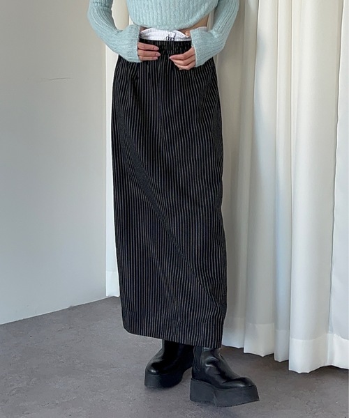 ウエストレイヤードがポイント。1枚でこなれ感のあるストライプスカート ■デザイン ウエスト部分がレイヤード風デザインになった、洗練された雰囲気のストライプスカート。 シンプルながらもディテールが効いているので、1枚でスタイリングが完成。 ウエストはゴム仕様で、ストレートシルエットがすっきりとした印象を演出します。 ■素材感 ウールライクなストライプ生地を使用し、ほどよい厚みとハリ感があり、きれいなラインをキープ。 落ち感のある素材で、シーズンレスで着用可能。 クラシカルな雰囲気のストライプ柄が、大人っぽく洗練された印象に仕上げます。 ■スタイリング ウエストデザインを活かすために、トップスをインするスタイルがおすすめ。 ショート丈のニットと合わせれば、異素材のコントラストが楽しめてこなれ感アップ◎。 同じ生地の「オーバーサイズストライプジャケットとセットアップで着用すれば、モードな着こなしが完成。 シンプルなアイテムと合わせるだけで、スタイリングが決まる万能スカートです。 ※詳しいお手入れ方法は商品タグをご参照ください。 「duei / デュイ」 "sensual, mode, daily, mix" しなやかさと自由なニュアンスを センシュアルな要素をプラスして 日常を飾り立てる 気分が高まる 洗礼された自分らしさを表現できる服を提案します 【商品のお気に入り登録】 完売カラーの再入荷通知やラスト1点の通知 プライスダウンの通知も受け取ることができます。 ぜひご登録ください◎ 【ブランドのお気に入り登録】 新商品や再入荷など、 ブランドの情報をいち早くお知らせします! ぜひご登録ください◎ ※ATTENTION※ ・屋外の光や照明の当たり具合で、実際の商品の色味と カラー別画像の色味に若干の違いが発生する場合がございます。 ・詳細画像と併せてご確認の上、ご注文いただきますようお願い致します。