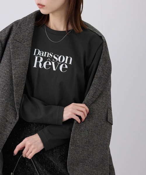 気楽に取り入れられて洗練された印象に仕上がるロンT。【素材感】 ・廃棄予定の衣料品や残反等を回収し、新たに繊維にするサーキュラーエコノミーのRENU(レニュー)素材を使用。 ・肌にあたる側がポリエステルなので汗が表面に響きにくく、さらっとした感覚で着られる。 【デザイン・シルエット】 ・ドロップショルダーとゆったりフォルムで、旬のスタイルに仕上げたロングスリーブTシャツ。 ・アソートロゴプリントがポイント。 【カラー】 ・ブラック(01):ブラック×シルバー箔 ・ホワイト(10):ホワイト×ゴールド箔 ・ホワイト系(11):ホワイト×シルバー箔 <ロゴの意味> La petite joie:小さな喜び Dans un re've:夢のなかで 【スタイリングポイント】 ・きれいめなジャケットのインに重ねると新鮮。 ・ニットなど素材感のあるスカート合わせで、冬らしいスタイルが完成。 ・冬はローゲージのボリュームカーディガンを羽織ると暖かみのあるコーデに。" ----------------------------- 裏地:なし 透け感:ホワイト(10)ホワイト系(11)はややあり 伸縮性:ややあり 生地感・厚さ:やや薄手 季節:春・秋・冬(カーディガンやジャケットのインナーとしても◎) ----------------------------- ※撮影時の光、お使いのモニター環境によって色の見え方が違う場合がございます。 ※モデル身長:165cm 着用サイズ:38